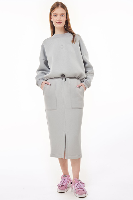 Современный комфортный костюм, состоит из зауженной юбки и укороченного свитшота. Отлично подойдёт для офиса, прогулок и путешествий. Пошит из теплой, комфортной ткани. Свитшот покроя оверсайз со спущенной линией плеча. Горловина, манжеты рукавов выполнены из ткани-компаньона кошкорсе. По центру переда вышивка-логотип в цвет ткани. Свитшот с кулисой по низу с резинкой внутри и фиксатором по центру переда. Юбка зауженная к низу, облегающая фигуру, длиной миди. Перед с удобными боковыми карманами, по центру переда разрез с отделочной строчкой. Пояс из ткани кошкорсе с резинкой внутри.