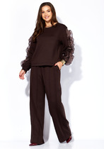 Современный комфортный костюм, состоит из зауженной юбки и укороченного свитшота. Отлично подойдёт для офиса, прогулок и путешествий. Пошит из теплой, комфортной ткани. Свитшот покроя оверсайз со спущенной линией плеча. Горловина, манжеты рукавов выполнены из ткани-компаньона кошкорсе. По центру переда вышивка-логотип в цвет ткани. Свитшот с кулисой по низу с резинкой внутри и фиксатором по центру переда. Юбка зауженная к низу, облегающая фигуру, длиной миди. Перед с удобными боковыми карманами, по центру переда разрез с отделочной строчкой. Пояс из ткани кошкорсе с резинкой внутри.