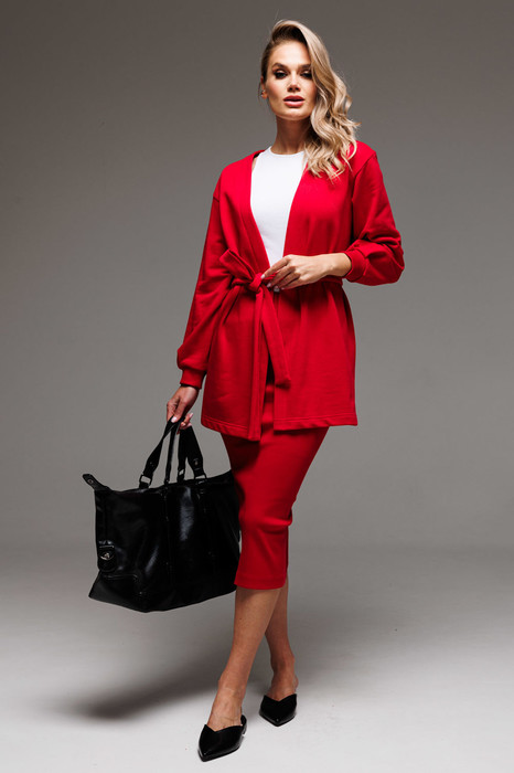 Костюм Gowear из футера в стиле smart casual поможет создать в меру строгий и одновременно расслабленный образ. Костюм состоит из жакета и юбки из эластичной ткани кошкорсе. Жакет прямого силуэт, с v-образным вырезом горловины, без застежки, с отдельным поясом. На левом переде вышивка-логотип в цвет ткани. Рукав свободный, со складками, присобран на манжету. Жакет без подкладки. Юбка прямая, облегающая фигуру с разрезом на спинке. Пояс цельнокроенный с резинкой внутри.