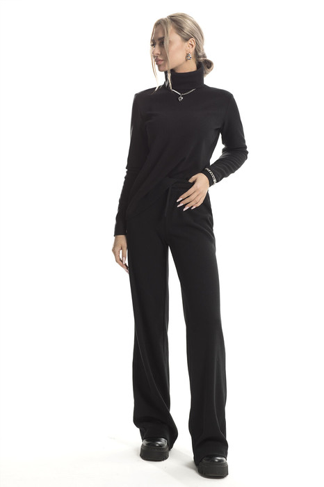 Джемпер с втачным воротником-стойкой и втачными рукавами. Брюки широкие с отрезным поясом, в пояс вставлена резинка.На переде пояса выметаны петли и вставлен шнур.