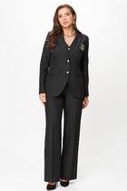 Блузон с центральной застежкой на петли и пуговицы, втачным воротником с отрезной стойкой. На уровне линии груди расположены накладные карманы. Спинка цельная. Низ фигурный. Рукав втачной, длинный, с отреной манжетой, застегивающейся на одну петлю и пуговицу. Юбка короткая, без пояса, верхний срез обработан обтачкой. Застежка на потайную молнию в среднем шве заднего полотнища.