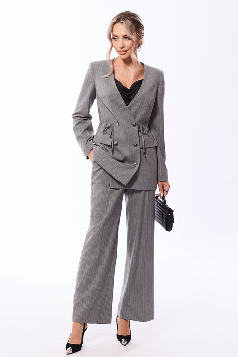 Жакет прямого силуэта с центральной двубортной застежкой на петли и пуговицы, без воротника, с V-образным вырезом горловины. По линии талии- кулиса со шнуром- завязкой. По переду с нагрудными вытачками. На уровне линии бедер расположены прорезные карманы с клапаном и двумя обтачками. Рукав втачной, длинный. Брюки прямые, с отрезным поясом, на поясе расположены шлевки. По спинке пояс присборен на резинку. По боковым швам расположены карманы. Вход в карман наклонный к боковому шву. Застежка гульфик.