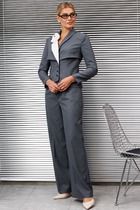 Жакет с центральной застежкой на петли и пуговицы, отложным врортником и лацканами пиджачного типа. По переду с нагрудными вытачками, накладными карманами. По спинке со средним швом. Рукав втачной, корокий. Юбка с отрезным поясом, застежкой на потайную молнию по среднему шву заднего полотнища. По переднему полотнищу односторонняя складка, закрепленная к детали петлями и пуговицами, по низу переднего полотнища- шлица. Задняя половинка со средним швом, талиевыми вытачкам. В области спинки пояс присборен на резинку.