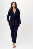 Блузка, без воротника, с круглым вырезом горловины, застежкой на навесную петлю и пуговицу в среднем шве спинки. По переду со средним швом и декоративным узлом. По спинке со средним швом и резинкой по низу. Рукав втачной, короткий. Юбка прямая, без пояса, верх обработан обтачками. Застежка на потайную молнию в среднем шве спинки. Переднее полотнище со средним швом, заканчивающимся разрезом.