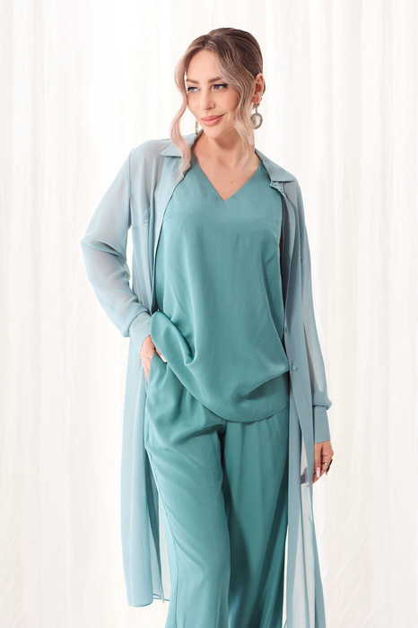 Блузон с центральной застежкой на петли и пуговицы, втачным воротником с отрезной стойкой. По переду с нагрудными вытачками, спинка цельная, по боковым швам- разрезы. Рукав втачной, длинный, с отрезной манжетой. Топ без воротника, с V-образным вырезом горловины. По переду с нагрудными вытачками. Брюки прямые, с отрезным поясом. Пояс присборен на резинку. Передние половинки с карманами. Вход в карман наклонный к боковому шву.
