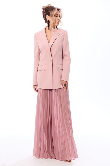 Жакет с центральной застежкой на петли и пуговицы, без воротника, с втачным воротником и отложными лацканами пиджачного типа. На уровне линии талтт расположены прорезные карманы с клапанами и двумя обтачками. По переду с фигурными подрезами, рельефами и талиевыми вытачками. По спинке со средним швом, рельефами, выходящими из проймы. Рукав втачной, длинный. Брюки- гофре расширенного силуэта, с отрезным поясом, без застежки, верх брюк присборен на резинку. Брюки без боковых швов.