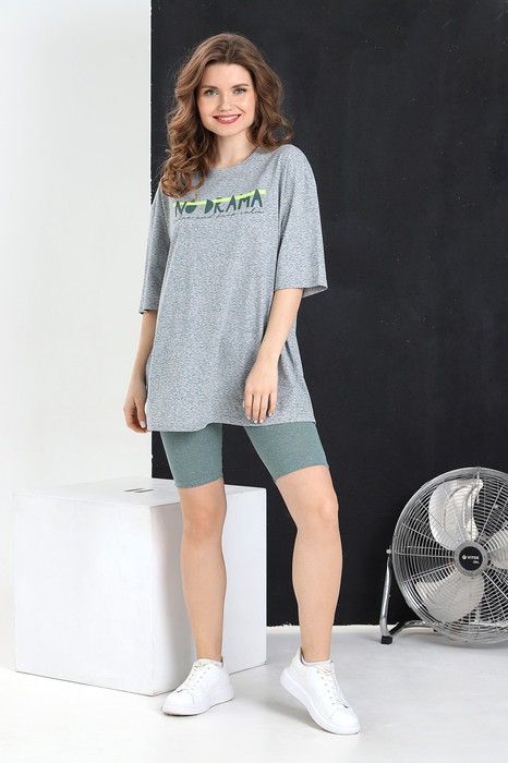 Футболка из набивного трикотажного меланжированого полотна «кулирка» свободного покроя, со спущенной линией плеча, короткими втачными рукавами, горловиной овальной формы, обработанной притачной бейкой и принтом на полочке, выполненным в технике «шелкографии».