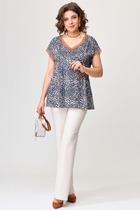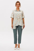 Блуза свободного силуэта со спущенным рукавом на манжете, изготовленная из тонкого джинсового полотна. Воротник рубашечного типа. По переду накладные карманы, застежка на петли и пуговицы, по спинке кокетка, в боковых швах разрезы. В качестве декора в комплекте съемная брошь в цвет платья.