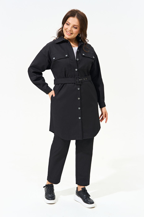 Джинсовый женский костюм с брюками и рубашкой. Рубашка удлиненная свободного силуэта с функциональными накладными карманами по переду и в боковых швах, рукава со спущенной линией плеча с манжетами, воротник рубашечный, застежка-планка на петли и пуговицы. Брюки полуприлегающего силуэта заужены к низу, пояс притачной на резинке по бокам, застежка на молнию, петлю и пуговицу, в боковых швах карманы. В комлект входит сьемный пояс из основной ткани. Материал при правильном уходе не теряет своих свойств.