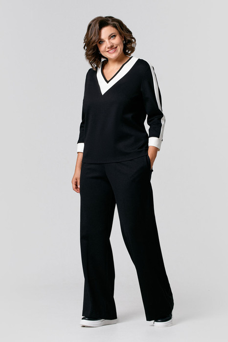 Костюм женский полуприлегающего силуэта с брюками и джемпером выполнен из трикотажного полотна средней плотности. В джемпере V-образная горловина и втачные рукава дополнены декоративными вставками молочного цвета. Брюки прямые с завышенной линией талии и притачным поясом на резинке, в боковых швах карманы. Изделие прошло тестовую стирку при температуре 30 градусов и химическую чистку: не меняет цвет и не линяет.