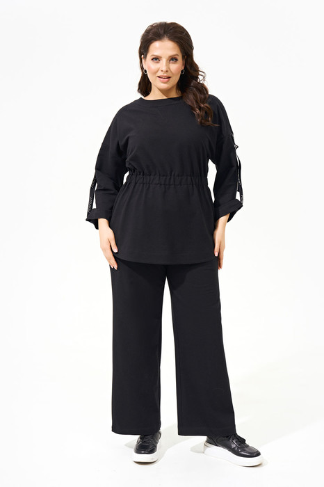 Костюм женский полуприлегающего силуэта выполнен из футера двухнитки класса пенье и состоит из джемпера и брюк. Джемпер с фактурной резинкой по линии талии; вырез горловины округлой формы; рукава со спущенной линией плеча и внутренней декоративной лентой (стильная деталь с изысканным акцентом), что позволяет регулировать высоту рукава; по спинке функциональная молния. Брюки свободного кроя прямые к низу на поясе-резинке с функциональными карманами в боковых швах.