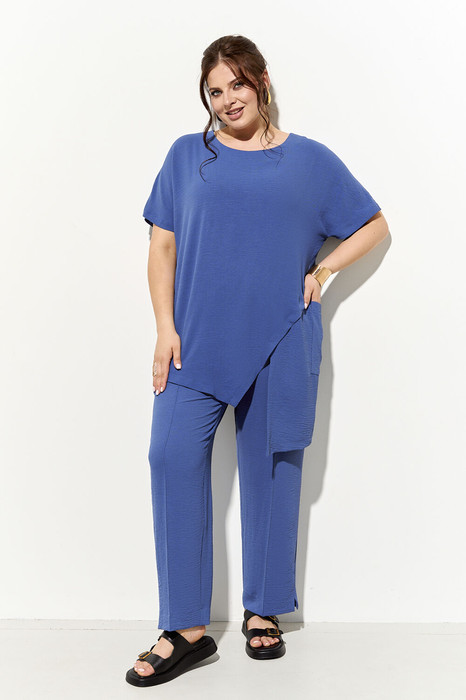 Костюм женский, состоящий из туники и брюк, выполнен из легкой струщейся ткани. Туника свободного силуэта, низ изделия ассиметричнной формы с накладным фукциональным карманом, спинка с акцентным треугольным вырезом.  Брюки классические  полуприлегающего силуэта заужены к низу, в боковых швах функциональные карманы, пояс притачной полностью на резинке. Костюм полностью соответсвтует заявленному размеру.