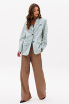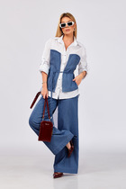 Комплект брючный, состоит из туники и брюк. Туника свободного силуэта из костюмно — плательной ткани. Горловина V — образной формы. По низу рукава и горловине вставлен довяз. Рукава — цельнокроеные. В боковых швах внизу блузы обработаны разрезы. Брюки средней посадки, прямые. Пояс на резинке обработаны боковые карманы. Декор — печать по низу туники.
