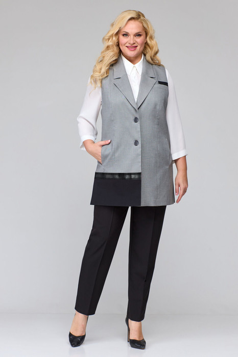 Комплект брючный 3-х предметный, изготовлен из костюмных тканей, состоит из жилета, брюк и джемпера.Жилет полуприлегающего силуэта. По переду рельефы, по правой полочке внизу контрастные вставки, по левой полочке вверху листочка. Воротник пиджачного типа, застежка центральная-бортовая на петли и пуговицы, в швах рельефов обработаны карманы. По спинке, декоративная планка, подрез и вставка из отделочной ткани. Жилетка на подкладке. Брюки средней посадки, пояс частично на резинке, застежка на молнию и пуговицу. Боковые карманы. Сзади кокетка. Блуза из легкой ткани.Воротник стояче- отложной, застежка планка на петли и пуговицы. Рукава втачные.