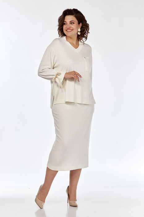 Костюм женский 2х — предметный выполнен из ажурного трикотажного полотна. Состоит из джемпера и юбки. Джемпер свободного силуэта горловина V-образной формы. По переду накладной карман. В боковых швах разрезы. Рукава спущенные, к низу обработана кулиса с декоративной тесьмой. Низ джемпера с перепадом длины. Юбка зауженная к низу, пояс цельнокроеный на резинке. Юбка на подкладке.