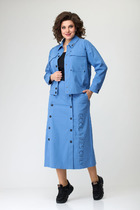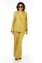 Комплект брючный двух предметный, состоит из жакета и брюк. Жакет женский изготовлен из легкой костюмной ткани, без подкладки, полуприлегающего силуэта. Горловина оформлена воротником пиджачного типа, застежка центрально-бортовая на две петли и пуговицы. Перед с подрезными бочками и таллиевыми вытачками. Карманы прорезные, с клапаном и двумя обтачками. На спинке средний шов со шлицей внизу. Рукава втачные двух шовные с разрезом по низу. Брюки выполнены из однотонной костюмной ткани классической посадки. В передних деталях обработаны карманы с отрезным бочком. Пояс притачной, застежка на молнию и петлю — пуговицу.