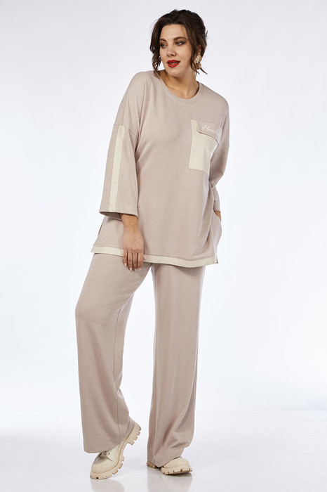 Костюм женский брючный двухпредметный, состоит из джемпера и брюк, свободного силуэта. Выполнен из трикотажного полотна. С отделкой из экокожи. Джемпер с округлой горловиной которая обработана планкой. По переду нагрудный накладной карман с клапаном. Спинка с кокеткой и планкой по центру дополнены пуговицами. Рукава спущенные, с лампасами. Низ джемпера обработан планкой из отделочной ткани. По боковым швам разрезы. Брюки прямые, с притачным поясом на эластичной тесьме. По передним частям брюк обработаны карманы с отрезным бочком. Костюм декорирован вышивкой.