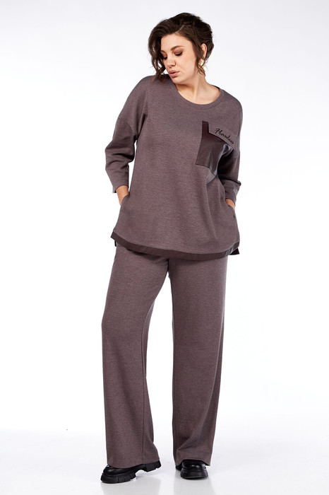 Костюм женский брючный двухпредметный, состоит из джемпера и брюк, свободного силуэта. Выполнен из трикотажного полотна. С отделкой из экокожи. Джемпер с округлой горловиной которая обработана планкой. По переду нагрудный накладной карман с клапаном. Спинка с кокеткой и планкой по центру дополнены пуговицами. Рукава спущенные, с лампасами. Низ джемпера обработан планкой из отделочной ткани. По боковым швам разрезы. Брюки прямые, с притачным поясом на эластичной тесьме. По передним частям брюк обработаны карманы с отрезным бочком. Костюм декорирован вышивкой.