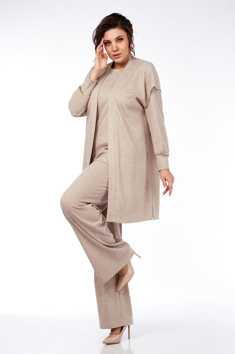 Костюм брючный 3-х предметный состоит из: джемпера, брюк, удлиненного жилета, изготовлен из трикотажного полотна. Джемпер полуприлегающего силуэта, с круглым вырезом горловины. По переду обработаны нагрудные вытачки. Рукава втачные длинные, на манжетах декоративная цепь. Жилет свободного кроя, спущенное плечо. В боковых швах высокие разрезы. Брюки средней посадки, пояс притачной на эластичной тесьме, в передних частях брюк обработаны карманы с подрезным бочком. Брюки прямого кроя.