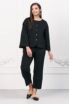Костюм женский 2х-предметный, состоит из жакета и юбки, выполнен из хлопковой костюмной ткани. Жакет прямого силуэта, с центральной бортовой застежкой на петли и джинсовые пуговицы. Горловина округлой формы с отрезной обтачкой. По переду обработаны рельефы и накладные детали фигурной формы, в которых выполнены карманы. На спинке обработаны рельефы и кокетка. Рукава спущенные, с широкой подгибкой низа. Изделие дополнено по спинке дизайнерской вышивкой. Юбка прямого силуэта с притачным поясом, с застежкой на петлю с пуговицей и молнию. Передние и задние детали юбки разрезные. По переду обработаны боковые карманы.