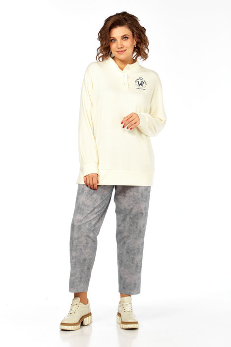 Комплект брючный, состоит из джемпера и брюк. Джемпер свободного кроя, изготовлен из трикотажного полотна. Горловина обработана воротником-стойкой и притачными планками с застежкой на петли и пуговицы. На полочке расположена вышивка. Рукава спущенные, по низу обработаны манжеты. По низу изделия  притачная деталь с разрезами по бокам. Брюки изготовлены из хлопковой костюмной ткани под джинс    В брюках обработан пояс, застежка на тесьму-молнию и петлю пуговицу. На задней части брюк кокетка и накладные карманы. На передней части боковые карманы.