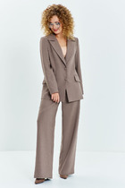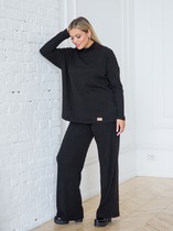 Костюм брючный двухпредметный, состоит из жакета и брюк, выполнен из ткани костюмно-плательного ассортимента. Жакет прямого силуэта. Горловина обработана воротником — стойка, застежка центрально — бортовая на петли и пробивные пуговицы. Перед с кокетками и рельефами выходящими из них. Имеются прорезные карманы с клапаном. Спинка на кокетке. Рукава рубашечного типа. Жакет дополнен печатью. Брюки свободного силуэта слегка заужены к низу. Пояс притачной, частично на эластичной тесьме, с застежкой на петлю и пробивную пуговицу. По переду обработаны карманы с листочкой и подрезным бочком. Вдоль швов костюма проходят контрастные строчки из отделочных ниток.