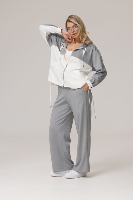 Костюм женский, состоящий из блузона и брюк. Блузон прямой, двухцветный, с центральной застежкой на декоративную молнию. Верхняя кокетка справа декорирована авторской печатью, по нижней части переда обработаны прорезные карманы с листочкой с наклонным входом. Спинка состоит из трех частей, кокетка отстрочена. В боковых швах обработаны разрезы, перед короче спинки. По низу изделия расположена шнуровка с наконечниками – для регулировки объема. Линия плеча спущена. Рукав притачной, двухшовный, по низу обработан манжетой, застегивающейся на кнопку. Горловина округлой формы, обработана капюшоном со шнуровкой.  Брюки прямые, сзади застрочены вытачки. В боковых швах обработаны карманы.  Верх брюк обработан отстрочным поясом контрастного цвета с резинкой.