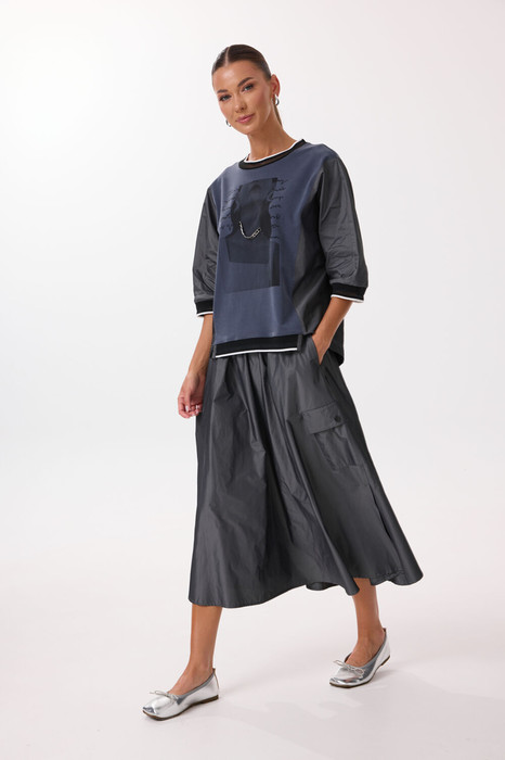 Джемпер женский кроя «летучая мышь». Центральная часть переда и спинки выполнены из ткани-компаньона. По переду расположена авторская печать с пласт. украшением. Низ переда декорирован довязом. Боковые части переда и спинки с рукавом выполнены из основной ткани. Рукав по низу обработан довязом. Горловина округлой формы с довязом.