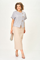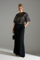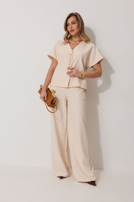 Костюм женский, состоящий из жилета и брюк. Жилет прямого силуэта на подкладке со спущенной линией плеча длиной до линии бедра. Спинка с центральным швом. Горловина V-образной формы обработана подбортом с обтачкой. Застежка жилета центральная на декоративные пуговицы. Брюки женские, прямого силуэта. По переду обработана застежка на молнию. Карманы наклонные с отрезным бочком. На задних половинках брюк застрочены вытачки. Верх обработан широким притачным поясом (частично на резинке), застегивающимся на петлю и пуговицу