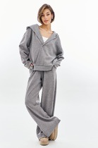 Костюм женский, состоящий из жакета и брюк. Жакет без подкладки, кроя «летучая мышь», с центральной однобортной застежкой на петли и пуговицы. По переду обработаны вертикальные прорезные карманы с листочкой. Спинка цельнокроеная, слева расположен декор в виде авторской броши. Горловина V-образной формы, обработана воротником пиджачного типа. Рукав 7/8, по низу обработан широкой притачной манжетой. Брюки женские, расширенные. По переду обработана застежка на молнию, обработаны карманы с наклонным входом. На задних половинках брюк застрочены вытачки. Верх обработан широким притачным поясом (частично на резинке), застегивающимся на петлю и пуговицу.