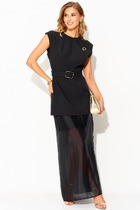 Топ А-силуэта с округлой горловиной, выполнен из однотонной ткани. Модель свободно ниспадает от линии груди, обеспечивая комфорт и лёгкость в носке, и гармонично дополняет комплект.