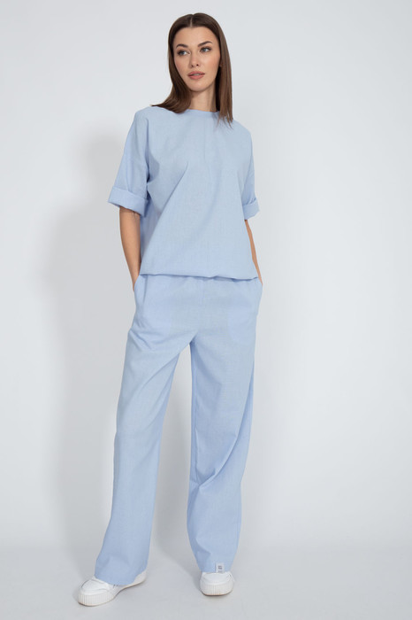 Костюм состоящий из брюк прямого свободного кроя с карманами в боковых швах и джемпера свободного кроя. С приспущенным рукавом и кулиской по низу изделия с возможностью регулировки ширины низа. Ткань лен. Отлично сочетается с шортами модели 4074, рубашкой 4073, рубашкой 4081, джоггерами 4082.