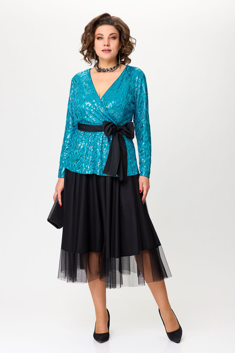Красивый нарядный комплект двойка на подкладке. Блузон из легкой трикотажной ткани расшитой пайетками с имитацией запаха, втачным поясом и баской по переду со сборкой, рукав втачной, длинный. Все детали блузона обработаны трикотажной подкладкой, что исключает дискомфорт покалывания пайеток. Юбка из сетки-фатин на поясе с эластичной лентой, на подкладке.