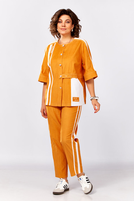 Супер модный костюм в стиле спорт шик из легкого хлопкового микровельвета с креш еффектом, идеален для летнего отдыха и городских прогулок . Яркий акцент костюму придает асимметричный карман на полочке с декоративными элементами имитации пояса и отделка из киперной белой тесьмы по рукаву полочке , спинке и брюкам . Блузон свободного кроя , без воротника , застежка на джинсовые пуговицы. Брюки средней посадки , заужены к низу , без застежки, на резинке, с карманами в боковых швах.