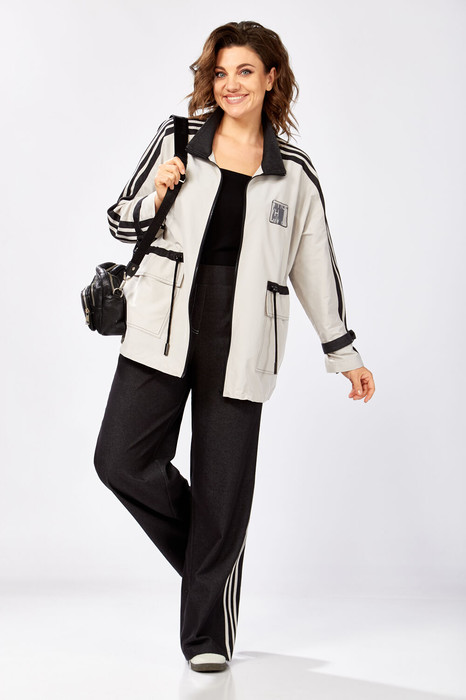Комбинированный брючный премиум комплект  в стиле спорт шик для внесезонной  носки. Удлиненная куртка-ветровка без подкладки, по талии с кулисой,  свободного силуэта на молнии, с накладными карманами, воротник - высокая отложная стойка, по рукаву контрастная отделка и регулируемый хлястик . Спинка с кокеткой.  Брюки средней посадки, прямые к низу  с декоративными лампасами , без застежки , на круговой резинке по талии,  с карманами в боковых швах.