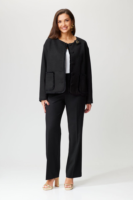 Комплект женский (жакет и брюки). Жакет женский, свободного силуэта, на подкладке, длиной ниже линии бедер, с втачными рукавами, с центральной сквозной застежкой на 5 петель и 5 пуговиц. Детали переда жакета с талиевыми вытачками, с накладными карманами, карманы оформлены декоративной тесьмой. Деталь спинки жакета с рельефными швами. Рукава втачные двухшовные, с передним и локтевым швами. Вырез горловины жакета округлой формы «под горло». Жакет с притачной понизу подкладкой. Край борта, низ жакета, низ рукавов и частично по локтевым швам оформлены декоративной тесьмой. Брюки на бедрах, плотно облегающие вверху и прямые к низу, с притачным поясом, по спинке в пояс вставлена эластичная тесьма. Застежка на тесьму-молнию и 1 потайной крючок. В боковых швах обработаны наклонные карманы. На задних половинках брюк обработаны по 1 вытачке. На передних и задних половинках брюк заутюжены «канты». Декор может отличаться от представленного на фотографии.Длина изделия Жакет: длина спинки – 60см. Брюки: длина по боковому шву – 106см.