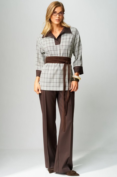 Жакет полуприлегающего силуэта, длиной до линии бедер. Воротник втачной. Перед с нагрудными вытачками и с втачными планками по горловине. Спинка цельная, в боковых швах разрезы. Рукава втачные одношовные длиной 7/8 с притачными манжетами, линия плеча спущена. Съемный пояс в комплекте.