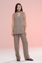 Комплект юбочный, состоящий из юбки и блузона . Юбка прилегающего силуэта, зауженная к низу, по среднему шву потайная застёжка-молния, в низу разрез. Верхний край юбка обработан обтачкой. Юбка на подкладке. Длина юбки по боковому шву -63 см. Блузон прилегающего  силуэта , слегка расклешён к низу, с нагрудными вытачками на полочке. Спинка со средним швом . В среднем шве спинки потайная застёжка-молния. Длина по спинке -56,5 см. Горловина обработана стойкой-воронкой, высотой -3,5 см. Рукав - реглан, слегка расклешён  к низу. Длина рукава-41,5 см. Декоративный съёмный пояс подчёркивает изящество фигуры.