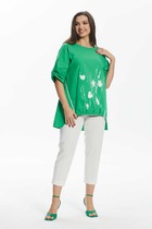 Летний женский костюм выполнен из лёгкой ткани. Жакет со спущенной линией плеча, стояче-отложным воротником и центральной застёжкой на петли и пуговицы. На уровне талии по бокам кулиса с поясом. По переду накладные карманы с клапанами. Брюки зауженные к низу, верхний срез брюк на притачном поясе на резинке и функциональным шнуром из основной ткани.