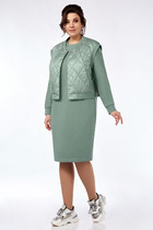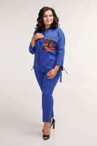 Жакет прямого силуэта. Воротник пиджачного типа. Передние половинки жакета с нагрудными вытачками и центральной застёжкой на петли и пуговицы. В боковых швах небольшие разрезы. Рукав втачной одно-шовный. Брюки свободного кроя, прямые. Передние половинки брюк с двумя складками по переду и застёжкой по типу «гульфик». Верхний срез брюк обработан притачным поясом, по бокам вставлена резинка. В боковых швах карманы «хулиганы».