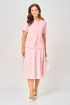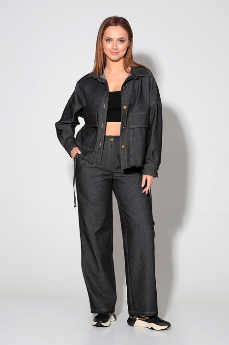 Жакет прямого силуэта со спущенной линией плеча. Воротник рубашечного типа. По переду накладные карманы с клапаном. Центральная застёжка на петли и пуговицы. По спинке настроченная кулиса со шнуром из основной ткани. Низ рукава на притачной манжете с застёжкой на петлю и пуговицу. Брюки на притачном поясе, от середины передних половинок и по спинке на резинке. Застежка брюк спереди по типу «гульфик». По бокам карманы с наклонным входом. Сзади накладные карманы.