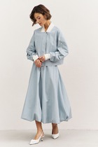 Комплект выполнен из хлопкового джинса. Куртка прямого силуэта, со спущенной линией плеча. Спереди центральная застежка на петли и пуговицы, по передним половинкам накладные карманы. Воротник стояче отложной. Низ рукава на притачной манжете, с застёжкой на петлю и пуговицу. По низу куртки вставлен шнур. Куртка без подкладки. Брюки на притачном поясе, на резинке, заужены к низу. Застежка брюк спереди по типу «гульфик». По бокам карманы с наклонным входом. Сзади накладные карманы.