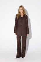 Комплект состоит из платья и укороченного жакета. Платье отрезное по линии талии, выполнено из двух видов ткани. Нижняя часть платья выполнена из шифона на трикотажной подкладке. В боковом шве потайная молния. Жакет длинной чуть ниже линии талии. Воротник стояче отложной, рукав втачной одно-шовный, центральная застёжка на петли и пуговицы. Низ жакета на притачном поясе.