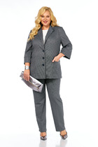 Костюм выполнен из струящейся ткани с люрексом. Блуза свободного силуэта. Горловина округлой формы обработана обтачкой. Рукав втачной, расклешённый к низу. По переду блузы нагрудные выточки, по боковым швам разрезы. Брюки прямого силуэта. Верх брюк на притачном поясе с эластичной тесьмой. В боковых швах карманы с наклонным входом.