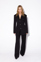 Жакет выполнен из костюмной ткани. Жакет Х-образного силуэта, длиной чуть ниже линии бёдер. Спереди центральная застежка на петли и пуговицы. По переду и спинке в области талии заложены складки. Спинка со средним швом. Воротник - цельнокроеная стойка. Рукав втачной двух шовный. Жакет на подкладке. Брюки прямого кроя. На передних половинках небольшая складка, переходящая в стрелку. Верхний срез брюк обработан притачным поясом, по бокам вставлена резинка, имеются шлёвки под ремень. Застёжка брюк по типу «гульфик». В боковых швах карманы «хулиганы». На задних половинках брюк вытачки.