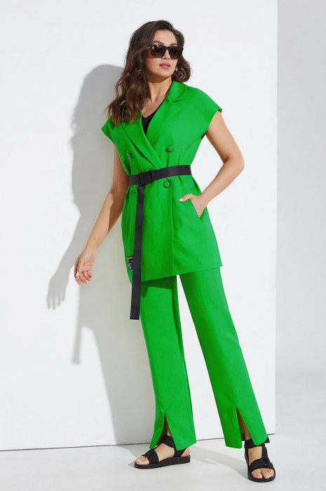 Жакет со стояче-отложным воротником пиджачного типа, спущенной линией плеча и двубортной застёжкой на петли и пуговицы. Перед с карманами с листочками в нижней части. Спинка со средним швом. На уровне талии съёмный пояс.