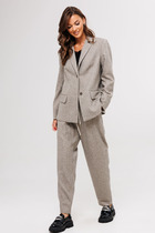 Жакет с округлым вырезом горловины, спущенной линией плеча и центральной застёжкой на петли и пуговицы. Перед с накладными карманами с отделкой в верхней части. Рукава втачные со складками по окату и манжетами по низу. Жакет на подкладке.