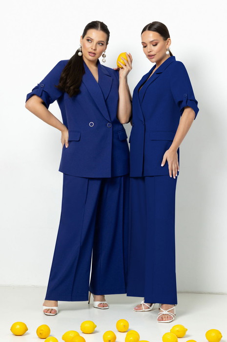 Трендовый брючный костюм с широкими брюками и свободным двубортным жакетом   настоящий хит. Двубортный жакет прямого силуэта мягкой формы с воротником пиджачного типа. Перед оформлен нагрудными вытачками из проймы  и горизонтальными карманами в рамку с клапанами. Спинка со средним швом. Рукава втачные свободные с патами. Прямые широкие брюки  средней посадки с отрезным поясом. В размерах 54,56,58 брюки с резинкой по талии. Застежка обработана как в брюках (гульфик с молнией и пуговица на поясе).  Вся обработка выполнена как в классических итальянских костюмах перед и спинка жакета на х/б подкладке.