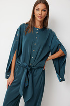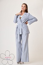 Жакет со стояче-отложным воротником пиджачного типа и центральной застёжкой на петли и пуговицы. Перед с накладными карманами в нижней части и декоративной листочкой с вышивкой в верхней части. Спинка со средним швом и талиевыми вытачками. Рукава втачные, с застёжкой на пату с пуговицей. На уровне талии съёмный пояс из ткани с вышивкой.