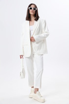 Брюки на поясе. Передние половинки со складками от пояса и наклонными карманами к боковым швам. Задние половинки с карманом в верхней части.